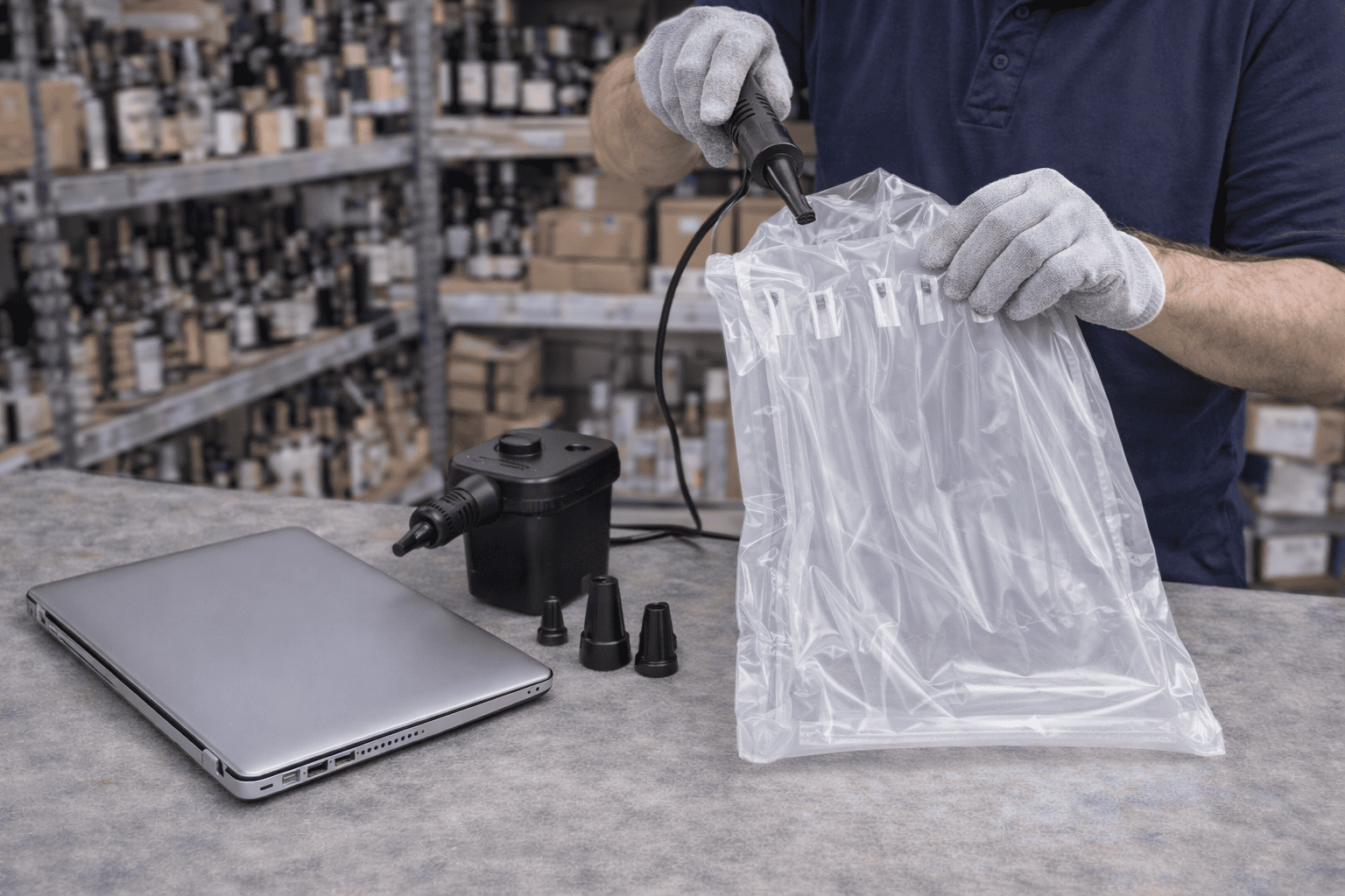Die Luftpolstertaschen werden flach (nicht aufgeblasen) geliefert und erst kurz vor dem Versand mit einer Luftpumpe oder einem Kompressor aufgeblasen. Das spart Lagerplatz und ermöglicht eine effiziente Versandabwicklung.
