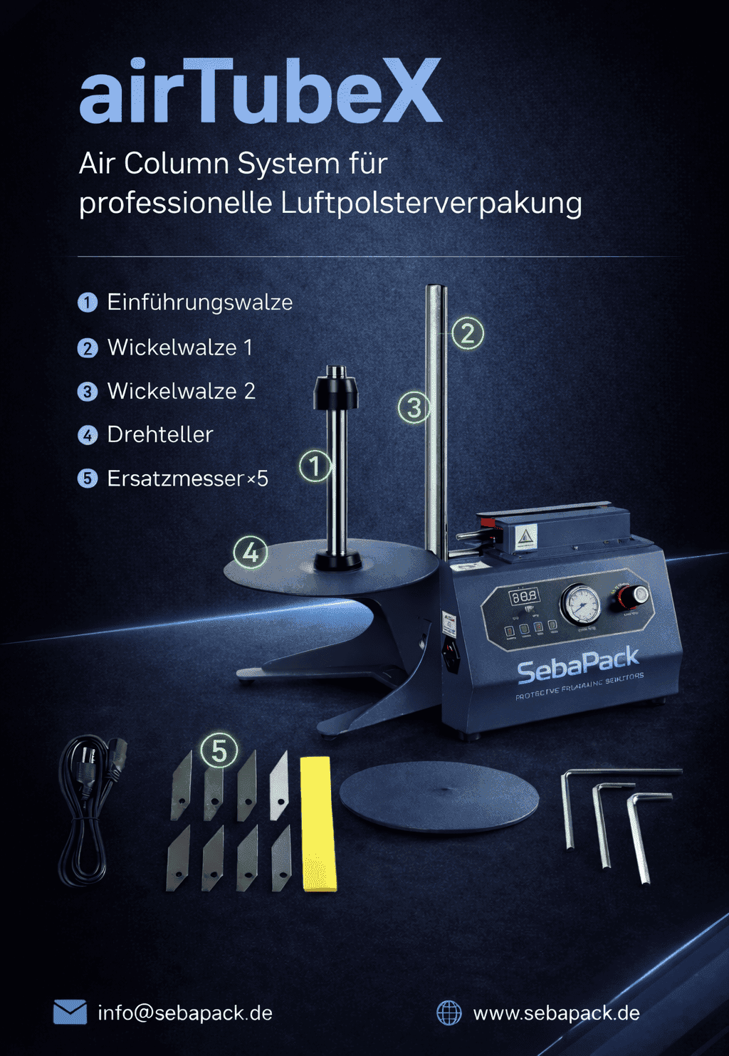 Die airTubeX Luftpolstermaschine ist ein kompakter und leistungsstarker Inflator zur professionellen Befüllung von Luftpolstertaschen, Air Column Bags und Luftkammerrollen. Ideal für Versand, E-Commerce und Industrie: Die Maschine sorgt für konstanten Luftdruck, gleichmäßige Polsterwirkung und eine effiziente Verpackungsabwicklung.